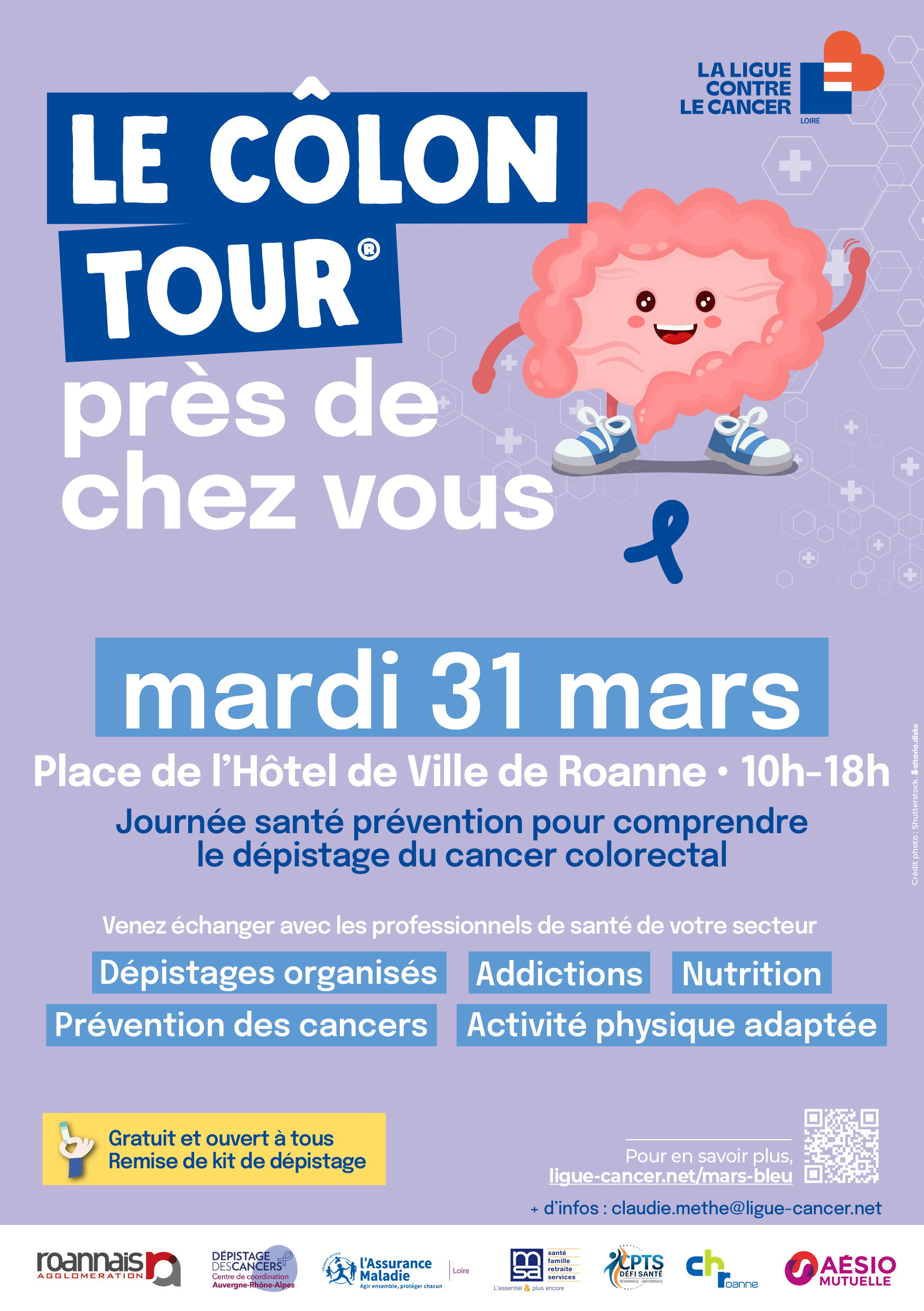 Dans le cadre de la campagne Mars Bleu, la Ligue contre le cancer de la Loire organisent deux journées de sensibilisation au dépistage du cancer colorectal. Parler d’un sujet tabou avec une approche ludique et pédagogique. C’est l’objectif du Côlon Tour® qui sera présent le lundi 30 mars de 10h à 17h à l’Hopital de Charlieu puis le mardi 31 mars de 10h à 18h place de l’Hôtel de ville à Roanne.