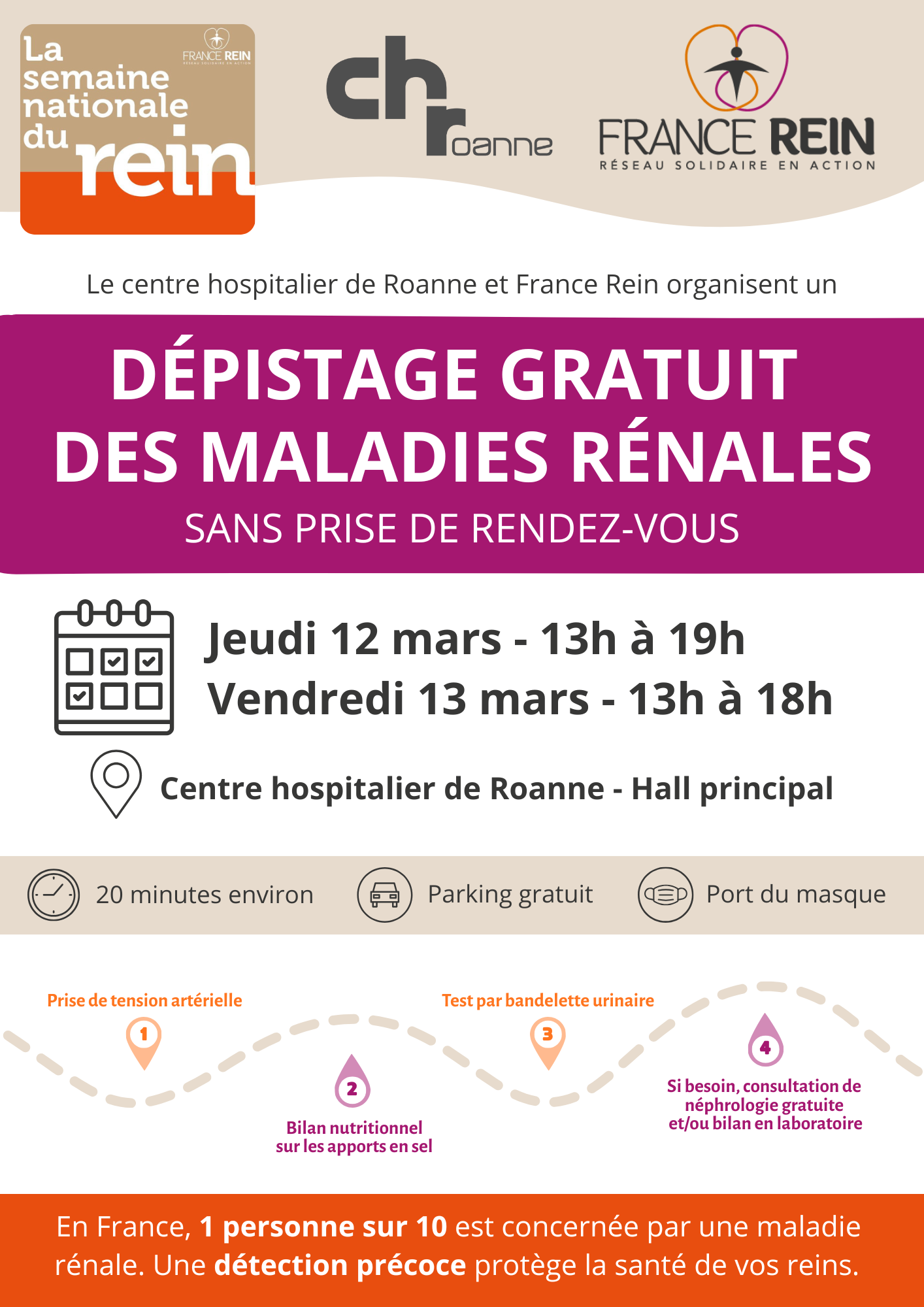 A l'occasion de la semaine nationale du rein et en partenariat avec l’association France Rein, le centre hospitalier de Roanne organise deux demi-journées de dépistage gratuit des maladies rénales.